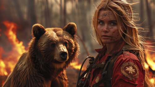 Eowyn from the Lord of the Rings, depicted as an East Tennessee EMT in Blount County rescuing a bear family in a forest fire in the Smokey mountains. --ar 16:9 --v 6.0 --s 750