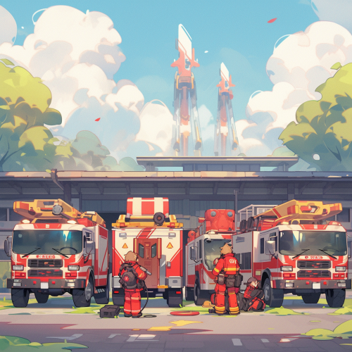 Fire station, firefighters in their pajamas, standing in the entrance field, three fire trucks parked in the garage behind them. --niji 5 --s 250