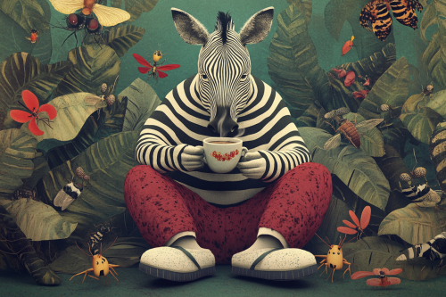 A cartoon of an anthropomorphic zebra with black and white stripes, sitting on the leaves, wearing slippers and drinking a cup of coffee, surrounded by funny little insects, funny ambience --ar 3:2 --personalize wz147bc --v 6.1