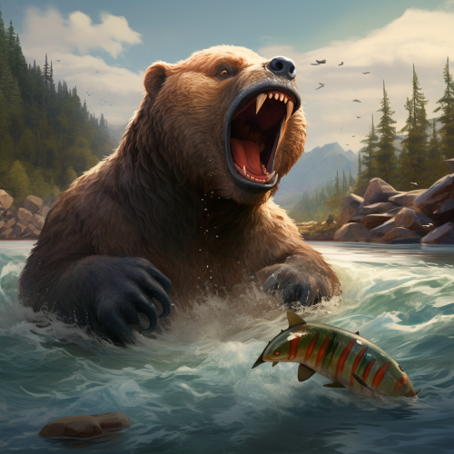 a bear with a salmon in his mouth at the mouth of a river, game art, pixar style