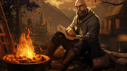 a bald, bearded man wearing an eye patch and sitting next to a bonfire, medieval, --ar 16:9