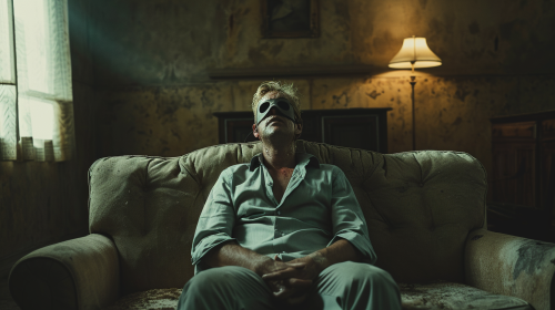 Cinematic wide angle shot of blindfolded blonde scared nervous man in his mid 30s in a shirt on an old sofa with hands tied, dark eerie living room, hitchcock style, dramatic light, --ar 16:9 --v 6.0