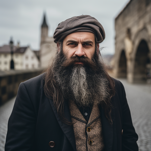Middle-aged man with a big beard on Charles Bridge in Prague