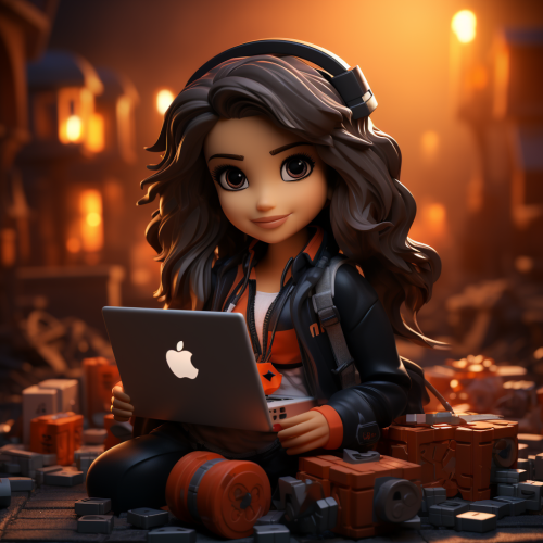 illustration of a LEGO with long brown hair and pink sparkles, yellow skin color. who works from a cell phone on social networks as a community manager, which has like symbols, heart symbols, shopping sarrtito symbols, Facebook logos, Instagram logo, YouTube logo --s 750