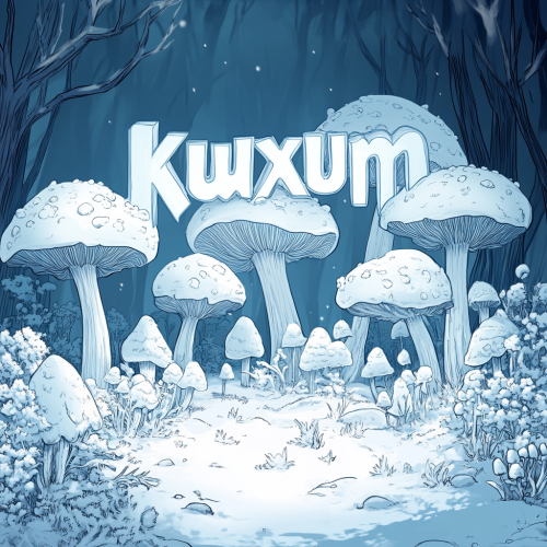 Create a drawing comic style scene with albino Jack Frost mushrooms. The image should have a cool, ethereal atmosphere with soft, cold lighting (blues and whites) to highlight the delicate, translucent quality of the mushrooms. The word 'kuuxum' should be the central focus, with each letter organically shaped by the mushrooms. The landscape should be minimal, with subtle details that support a mystical, serene feeling, designed as a potential brand logo