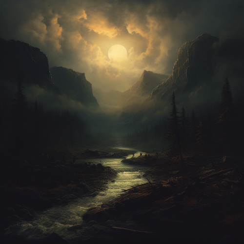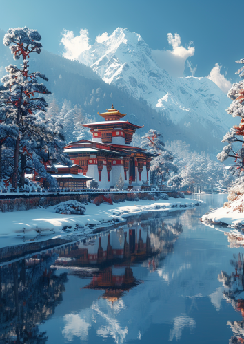 On the riverbank, reflections. medieval Illustration image with Quantum parallel manipulation techniques refinement, Bhutan, Tombs, medieval style, and a Ethereal view --v 6.0 --c 15 --ar 5:7 --s 750