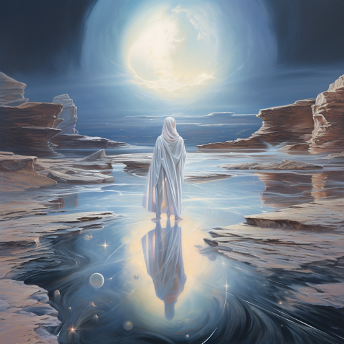 full length head to toe ethereal being translucent flowing white robe, standing on a lunar landscape another planet with cliffs, dipping toe in a clear water pool in the landscape, moons and stars and nebulas in the sky, hyperrealistic, mystical, magical, --style raw