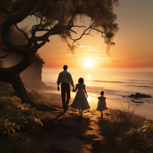 A family walking along the beach emerging from a nature trail, a serene moment, landscape view in the style of Impressionist, with shadows lengthening as the sun sets, highly detailed, ethereal atmosphere --no cityscape --s 250
