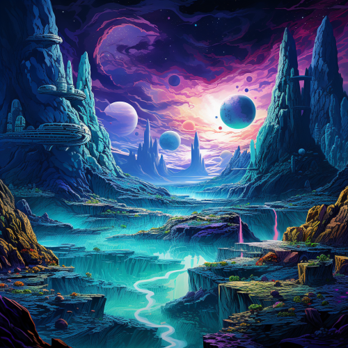 digital illustration / intricate futuristic mountainous aquatic landscape / utopian aesthetic / inspired by science fiction and other speculative fiction genres / rich colors / intricate patterns / otherworldly alien environment / futuristic sci-fi / fantasy / imposing / awe inspiring / powerful / bold composition / dynamic / action-packed / exorbitantly detailed / excessively realistic / clean and precise aesthetic / 32K UHD resolution / cinematic lighting / cinematic shapes / cinematic effects / ray traced / high 3D octane rendering
