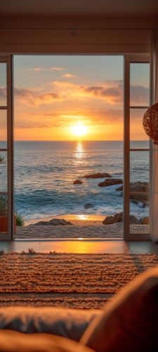 realistic centered photo from inside of a beach house looking out over the sand and shimmering ocean with the california coastline in the distance on a beautiful sunny day with golden sunlight at 24mm, 50 megapixels, DPI 300, --ar 9:20 --s 750 --v 6.0 --style raw