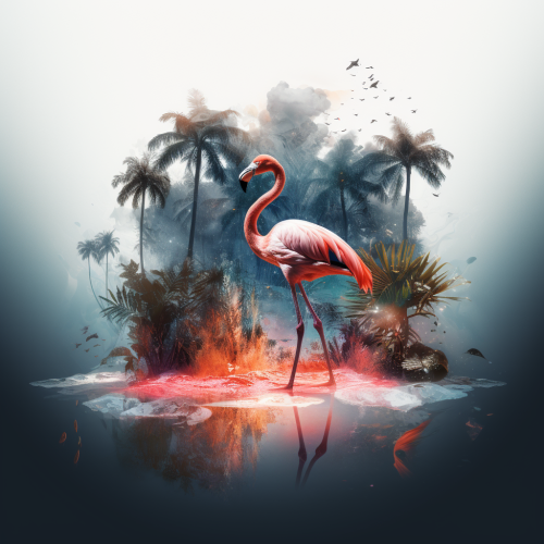 double exposure of flamingo's silhouette with a tropical forest inside, beach outside