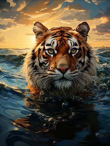 crazy fine art, little psyche, anime and cartoon art, tiger in the front of boat in the ocean, quiet waters, sunset, wide angle, bright colors, ultra detailed, realistic --ar 3:4 --s 640