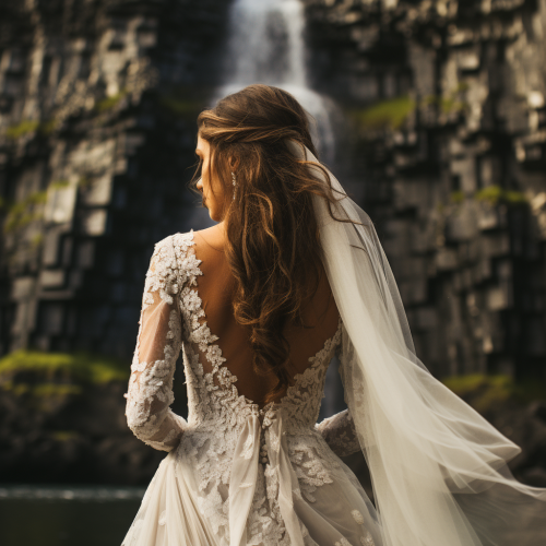 a beautiful bride seen from the back, flowing white veil, standing by a waterfall in Iceland, sunshine --v 5.2 --s 250