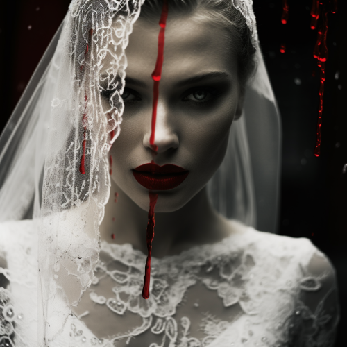 black and white, close up, photography, a mafia bride, bright red lips, bright red spatters on wedding dress