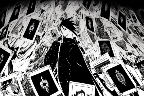 Manga Cell of a tarot card, Bleach, Manga Drawing, Anime Drawing, Black and White Style, Early Shonen Jump --niji 5 --ar 3:2