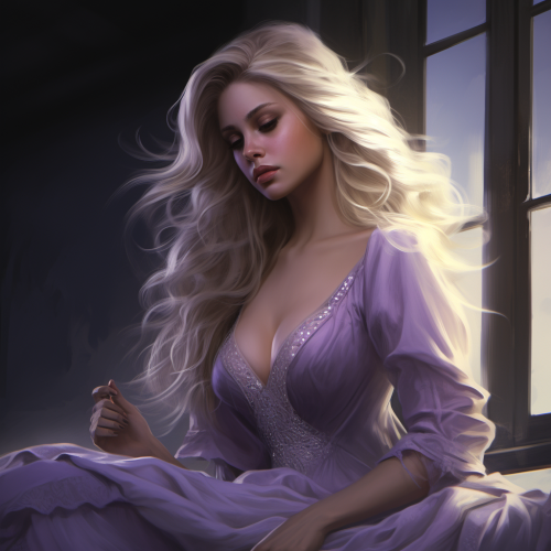 A beautiful sad woman with long white wavy hair wearing a diaphonus gown of purple.