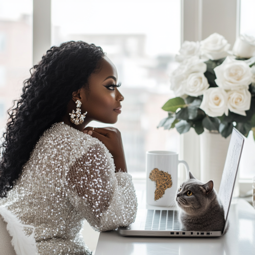 beautiful black woman facing backwards wearing white sparkling top with laptop on desk with white coffee mug that has africa map on it, in large bright light home office with white roses looking at happy grey cat
