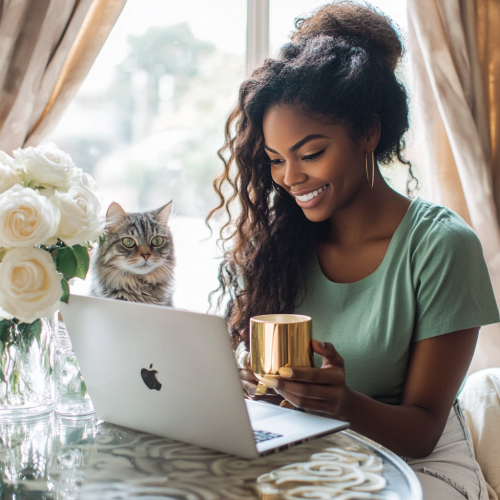beautiful black woman smiling wearing green sparkling top with laptop on desk with coffee mug in large cozy home office with white roses looking at happy grey cat