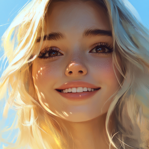 ((masterpiece, highest quality, best quality, official work of art, beautiful and aesthetically pleasing:1.2), 1 girl, beautiful, high detail, blonde hair, brown eyes, blue background smiling face, looks into the eyes, medium shot, expressive face, adult girl