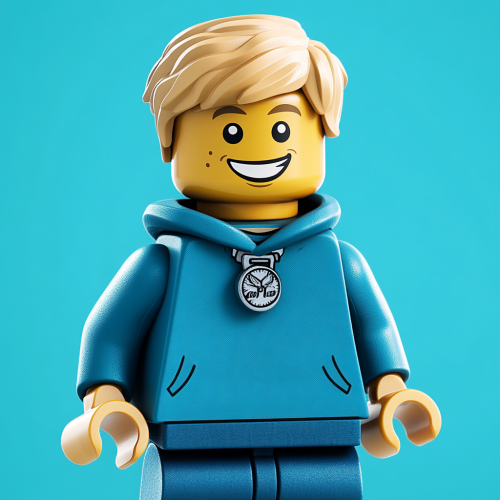 lego man, toy, short blonde hair, brown eyes, blue hoodie and jeans with a silver watch on, smiling happy face, 4k hyper realistic, simple background, turqouise blue