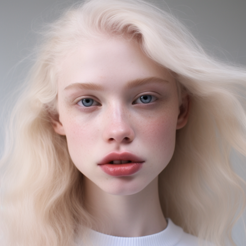 albino young woman, pale blonde hair, pale blonde eyebrows and eyelashes, light brown eyes, pretty, wide lips