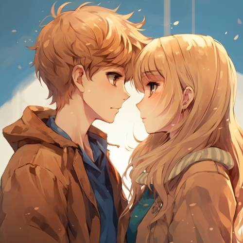 anime blonde boy with a girl . The girl has brown hair. The boy blonde hair and blue eyes. Kiss
