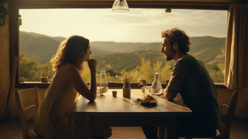 5 mm lens ari alexa 4k hyper realistic cinematic image of a table in a beautiful flandscape with a original and funny fancy like a boho long brown hair woman and a dark cloths cine man 50 years old spain men ,couple of lovers one spain mallorca Brown and curly short hair men and a woman brown blonde large hairwoman style william eggelston, anderson and kusturika styla --ar 16:9