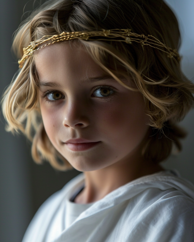 gold halo headband , beautiful 10 years old boy, blonde hair, brown eyes, white robe --ar 4:5 --v 6.0