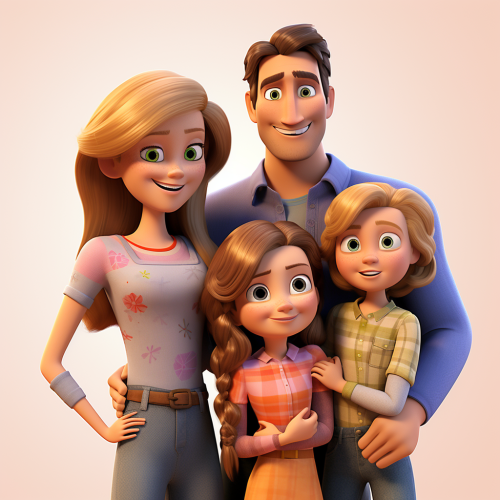 Create a heartwarming 3D rendering in Pixar style featuring a loving family of four. The family comprises a tall, gentle-looking dad with warm brown hair and kind blue eyes. His wife, the mother, has short and lively blonde hair, complemented by her bright blue eyes. They have two delightful ten-year-old daughters, both with long, flowing blonde hair and the same captivating blue eyes. Lastly, there is their adorable five-year-old son, whose short blonde hair perfectly matches his sparkling blue eyes.