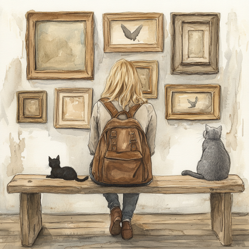 Watercolor drawing of a woman sitting with her back on a rustic wooden bench without a back. The woman is blonde. She looks at a wall filled with antique gilded frames like in a museum. She has a brown leather backpack on the bench to her right. To her left is a little black kitten sleeping next to her. Next to the bench, on the right, there is a gray cat. The colors of this watercolor drawing are: beige, brown, terracotta and brown.