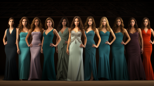 group of beautiful thin women, long hair, 30 years old, wearing formal dresses, assorted colors, full body shot, --ar 16:9