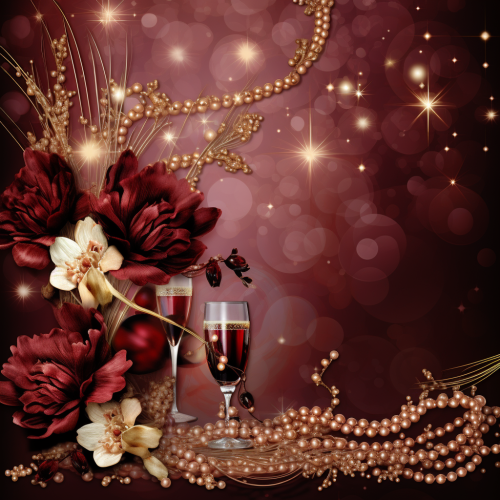 An invitation to a dinner party printed on thick, ivory-colored paper with a deep burgundy border. The invitation is written in French calligraphy or embossed lettering, adorned with gold leaf accents. The invitation is tied together with a burgundy ribbon, and it is sealed with a wax seal, 3D effect, exaggerated detail, 24K, elegance, elitism, uber formal, --ar 16:12 --v 6.0 --s 750