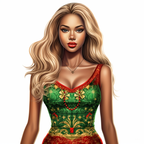 Dark skin Black woman with beautiful Honey Blonde long bone straight hair, beautiful lips chest green red gold Christmas dress Christmas very detailed clipart on a white background --s 750 --v 5.1