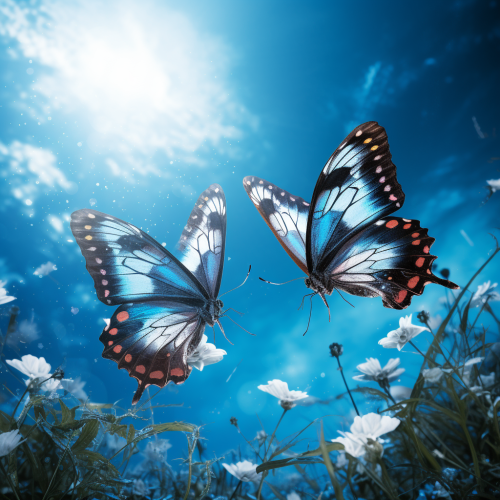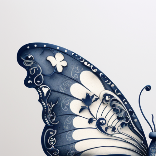 Surreal scene of beautiful hairy gay in a whirlpool, each adorned with delicate blue and white floral porcelain patterns on their wings. The floral patterns, inspired by intricate porcelain designs, add a refined elegance to the butterflies’ appearance, contrasting beautifully against the deep blue of the sky. Natural sunlight filters through the trees, casting soft shadows and illuminating the detailed patterns on the butterflies as they fill the sky. Lush green foliage frames the scene, and a few butterflies hover in close detail, their patterned wings in sharp focus, while others form a dreamy, ethereal swarm in the background. This captivating image combines nature’s beauty with an artistic, whimsical twist, creating a serene and enchanting atmosphere. --s 750 --v 5.0