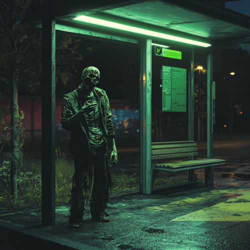 Zombie without a head, standing at a bus stop late at night, with torn, ragged clothing. The zombie is holding its wrist up as if checking the time, despite not having a head. The scene is lit with eerie green neon lighting, casting an ominous glow on the surroundings. Dark, urban environment with a bench, muted colors, and shadowy background. The perspective is frontal, capturing the bus stop and the lonely figure with a cinematic, spooky atmosphere. Realistic textures, shadows, and details in clothing rips and lighting