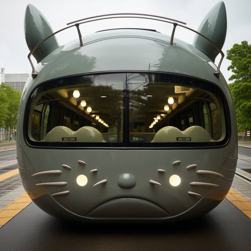 real cute modern round bus, totoro eyes as headlight, totoro ears, totoro mouth as grill of bus, at bus stop, acute angle photo