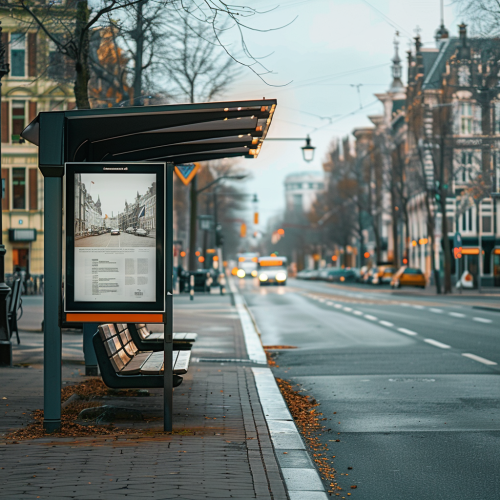 Place: Panama. Image: cinematic studio photography of bus stop with a vertical white screen, solid and structured at the street sublte very rich and wealthy neitghborhood, mansions in miami, soft shadows slightly blurred sunny day --ar 16:9