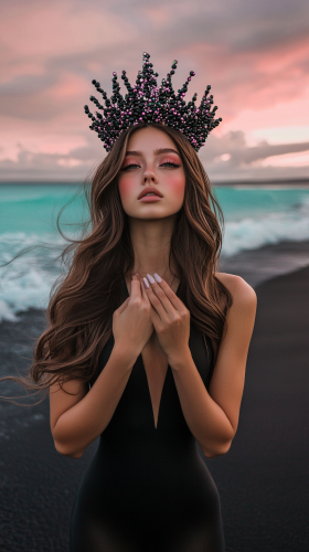 Low angle shot of a beautiful brunette girl with long wavy hair, she is standing at black sand, wearing huge crown twice bigger than her head made of black and pink pearls, sunny day, a turquoise ocean swirling around her feet , sky with pale pink clouds at background, full body , bright colors --ar 9:16