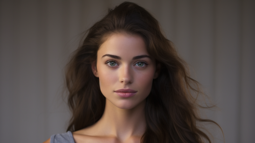 medium shot of a brunette girl, looking straight, natural light, real light, real, realistic, ultra-detailed 8k image light grey studio background, iso 200, modern, minimal, asymmetrical balance, long exposure, highly detailed, UHD, HDR, Sony A7 Siii, HD Lens High Definition, Soft color, soft image, soft colors inspirational, 4K --ar 16:9 --s 250