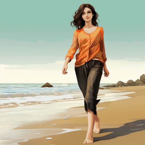 Very cute brunette girl walking on beach, aged around 40, realistic, full body