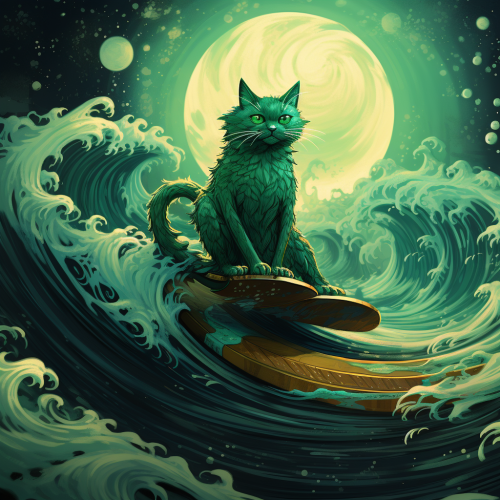 a green cat on a surfboard, riding on a pipeline wave, on the moon, zoomed out 4x