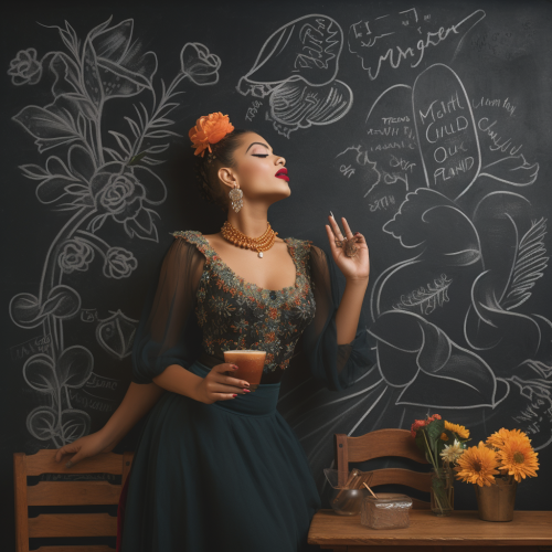 Generate an image of a chalkboard with a colorful chalk drawing of a table full of food. The image should have the quality and detail of a real photograph.
