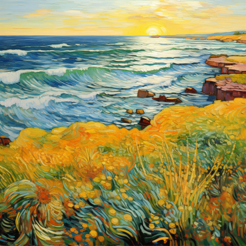 A colorful pencil sketch of a coastal scene, with pronounced pencil lines drawing the waves, shore, and rocks, deep blue and vibrant green accents for the water and grass, creating a contrast between detailed sketch lines and rich, vibrant colors. Created Using: bold pencil strokes, vivid blue and green hues, detailed linework, dynamic sketch style, vibrant landscape, hand-drawn feel, high-contrast color palette --ar 3:2 --v 6.0