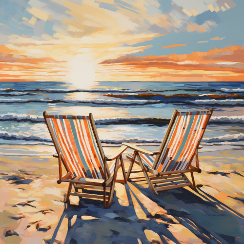 a painting of a beach at sunset, with two striped beach chairs. the style is thick visible brush strokes