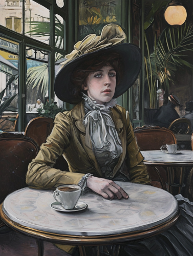 in the style of Agostino Arrivabene edwardian woman in a paris cafe, black art nouveau, cool dark color, decadent, moody, ominous doom, opulent, dark gothic --ar 4:3 --uplight --v 5.2