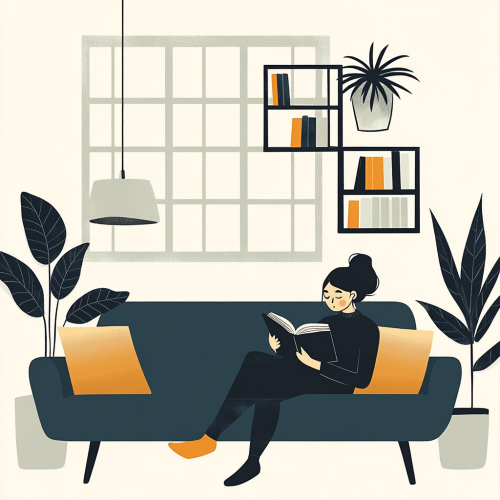 une illustration minimaliste, friendly, Montrant dans la même image, un personnage féminin en train de lire un livre sur un sofa situé à voté d'une fenêtre