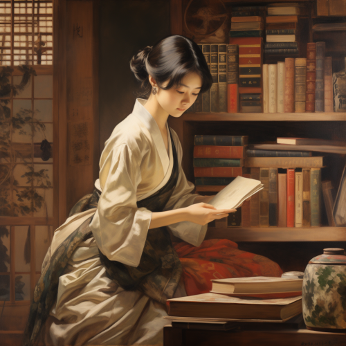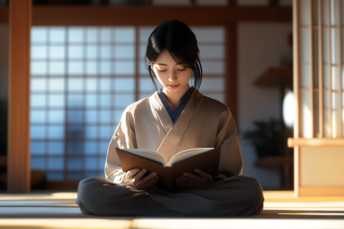 Japanese woman reading a book in a quiet and cozy home setting, natural light creating a warm and relaxed mood, minimalistic interior, casual clothing, neat black hair, surrounded by simple and elegant decor, evoking a calm and peaceful atmosphere. Photorealistic, highly detailed, 8K resolution --ar 3:2 --v 6.1 --style raw