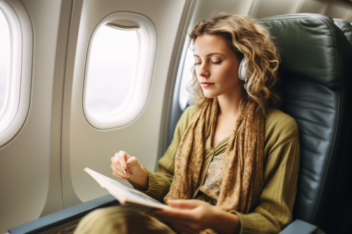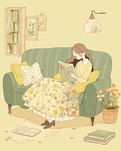 A woman in her twenties is sitting on the sofa and reading a book. An illustration style used for essay illustrations. Soft cream colored background. --ar 4:5 --style cute --niji 5