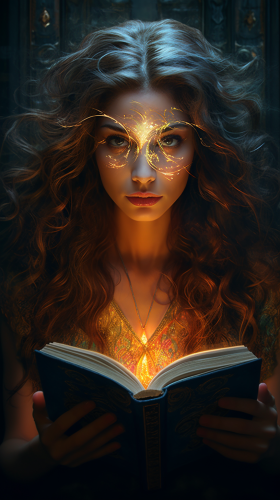 Flat 2d pixar style character + a woman reading a magic book with magic and lights, white background, isolated, isolated