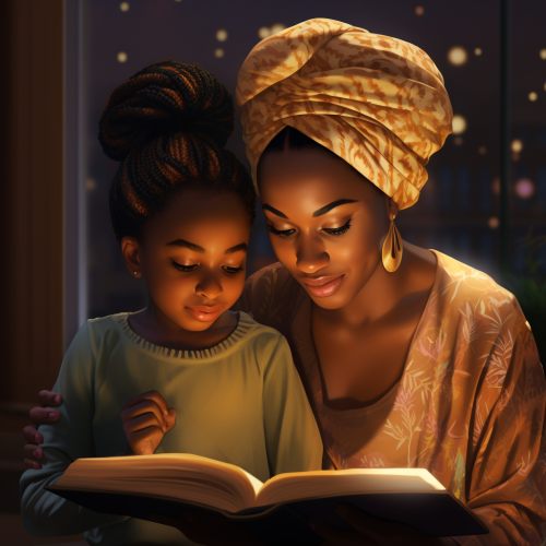 A Black Woman Teaching Young Black Girls While Reading a Book With there head Covered with a Headwrap